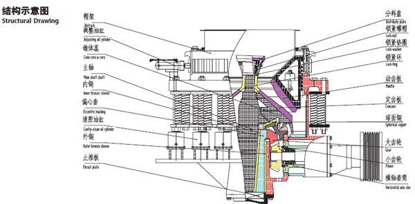 DMC复合圆锥破碎机工作时,由电动机通过三角带、大带轮、传动轴、小锥齿轮、大锥齿轮带动偏心套旋转,破碎圆锥轴心线在偏心轴套的迫动下做旋转摆动,使得破碎壁表面时而靠近 又时而离开轧臼壁的表面,从而使物料在定锥与动锥组成的环形破碎腔内不断地受到冲击、挤压和弯曲而破碎。经过多次挤压、冲击和弯曲后,物料破碎至要求粒度,经下部排出。